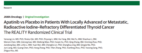 2021年12月16日,权威医学杂志《JAMA Oncology》(影响因子31.777)在线发表阿帕替尼的一项III期临床研究(REALITY)——甲磺酸阿帕替尼片治疗局部进展/转移性放射性碘难治性分化型甲状腺癌(RAIR-DTC)患者的多中心、随机、双盲、安慰剂对照临床研究。此研究由北京协和医院的林岩松教授和南京金陵医院的秦叔逵教授发起,在全国21个研究中心展开,由AG官网医药中央医学事务部团队支持完成。