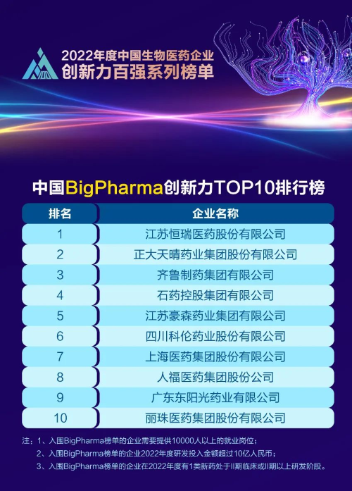 同日,2023米思会(中国医药健康产业共生大会)发布“2022年度中国生物医药企业创新力百强系列榜单”,AG官网医药再蝉联“中国BigPharma创新力TOP10”榜首。该榜单自2021年启动评选以来,AG官网医药稳居榜首。