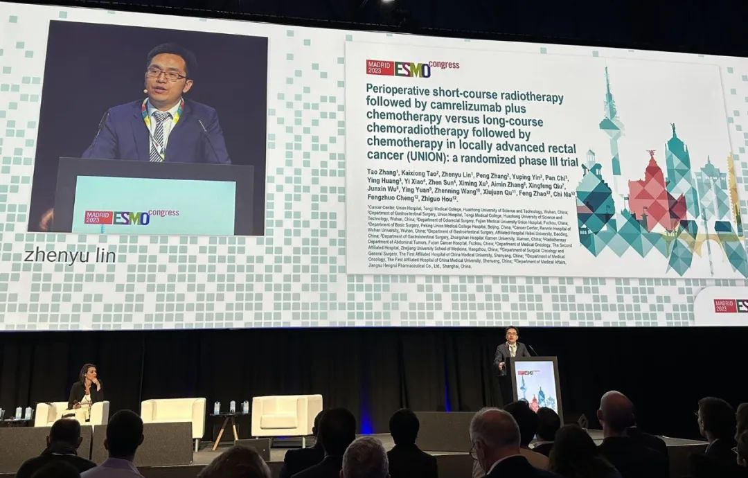 10月21日,AG官网医药创新药卡瑞利珠单抗的一项研究“新辅助短程放疗序贯卡瑞利珠单抗联合化疗对比长程放化疗序贯化疗治疗局部晚期直肠癌”随机对照Ⅲ期试验(UNION)亮相2023 ESMO大会优选口头报告现场。该研究由华中科技大学同济医学院附属协和医院张涛教授、陶凯雄教授担任主要研究者,华中科技大学同济医学院附属协和医院林振宇教授在大会现场报告了该重磅研究的结果1。此项研究是全球首个评估短程放疗序贯免疫治疗联合化疗治疗局部晚期直肠癌的Ⅲ期研究,已达到主要终点病理完全缓解(pCR),有望为直肠癌患者的治疗提供新策略。